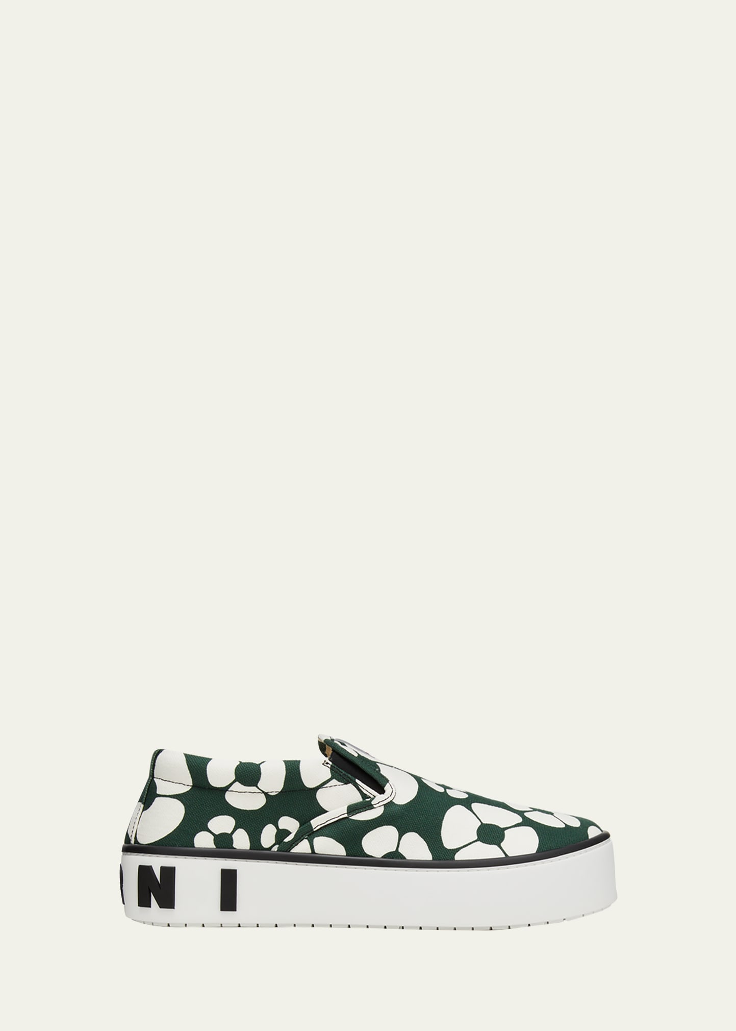 Marni x Carhartt® collaboration low-top sneakers in clover-printed canvas Flat heel Round toe Logo label at tongue Gored elastic inserts at the sides Padded collar Leather lining Raised logo lettering at heel Rubber outsole Slip-on style Made in Italy