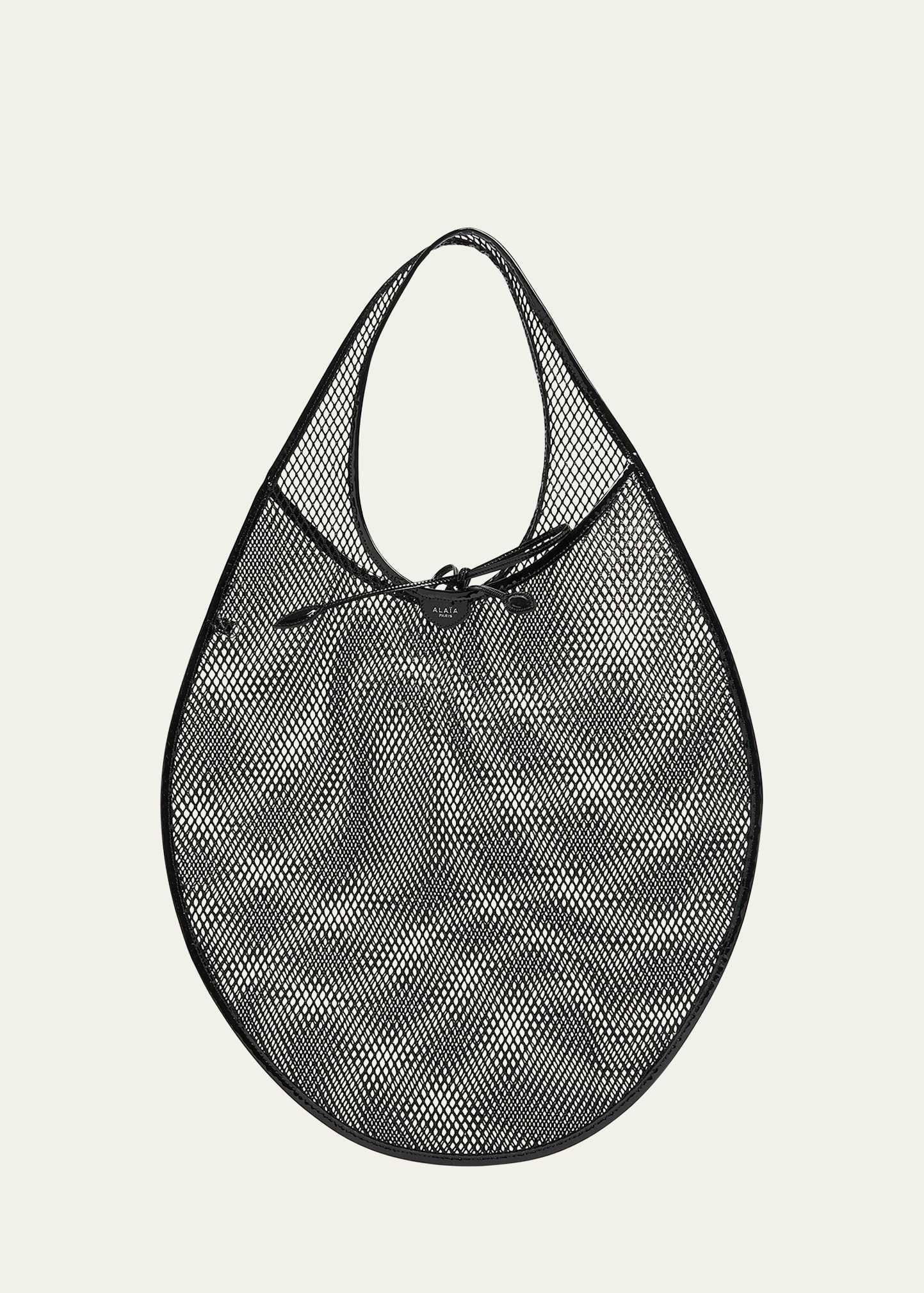 ALAIA shoulder bag in mesh nylon and leather Flat shoulder strap Open top with self-tie closure Unlined Approx. 7.9"H x 15.8"W x 3.9"D Made in Italy