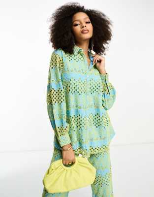 Y.A.S eyelet oversized shirt in blue and yellow - part of a set