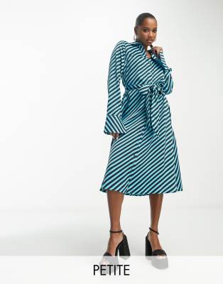 Y.A.S Petite satin maxi shirt dress with tie belt in blue diagonal stripe