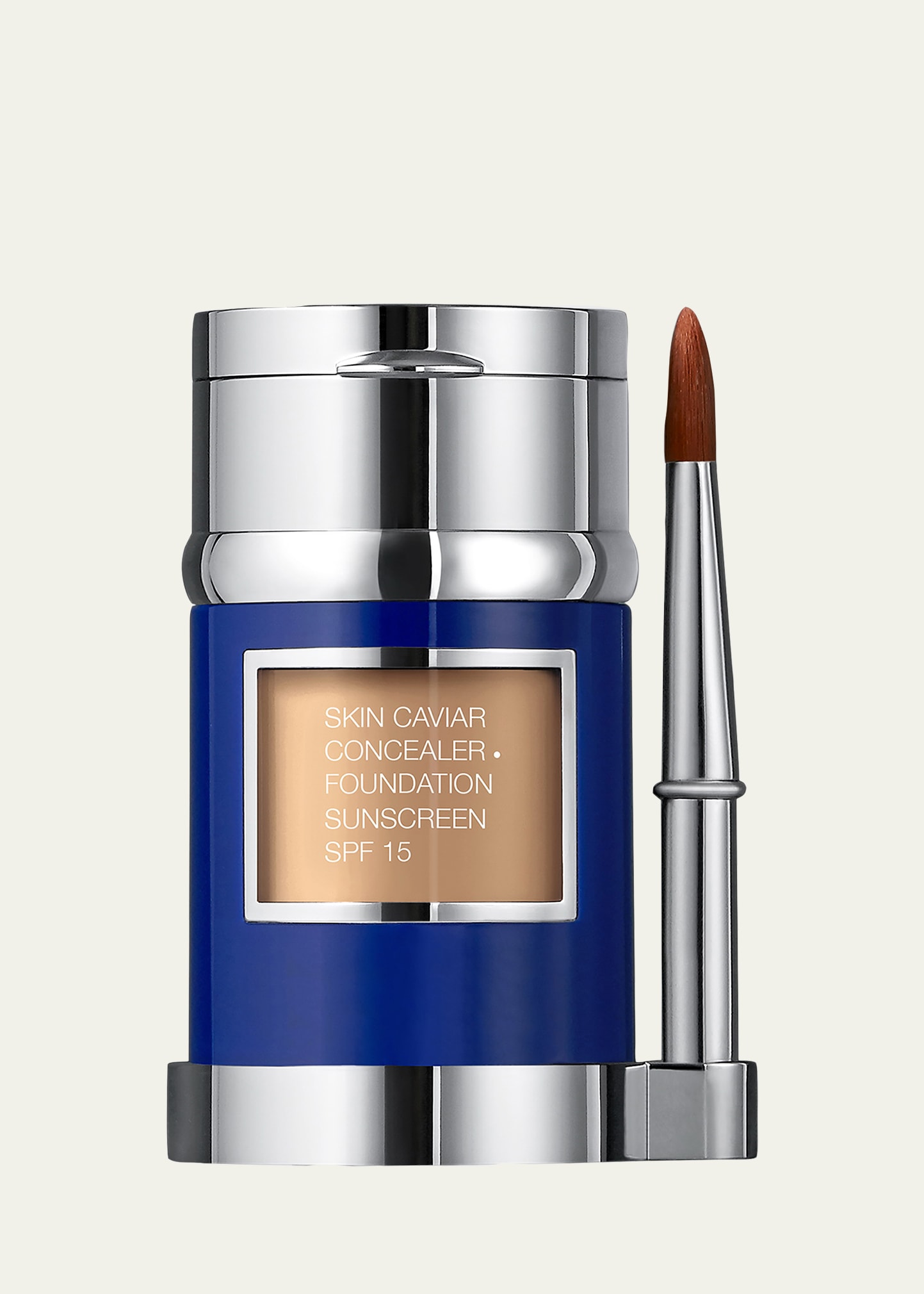 La Prairie 1 oz. Skin Caviar Concealer + Foundation Sunscreen SPF 15 Caviar-infused cream foundation What It Does - Natural-looking color perfects the complexion in this dewy foundation and exquisitely matched concealer, infused with Caviar Extract. The luxurious cream emulsion offers full coverage and the concealer camouflages under-eye darkness and deeper imperfections. - The infinitely flawless finish to your Skin Caviar ritual. Start with Skin Caviar Essence-in-Lotion, followed by S.