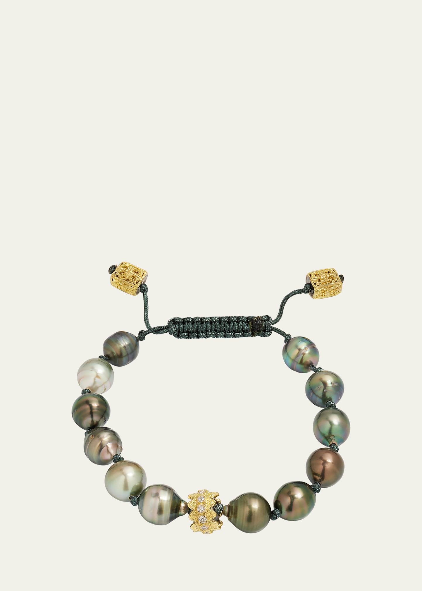 18-karat yellow gold and sterling silver 10mm naturally hued Tahitian cultured pearls Carved crivelli station with diamonds Diamond total carat weight: 0.25 Adjustable length Pull-cord closure Made in USA