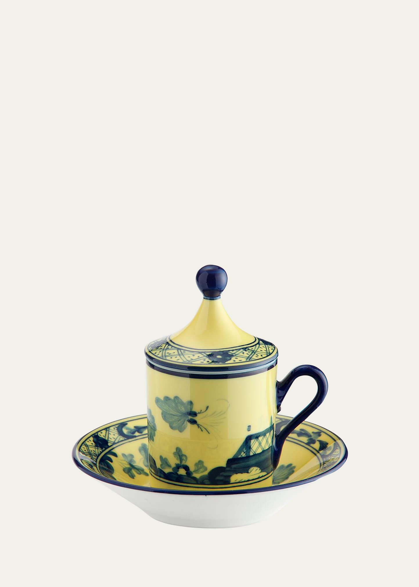 Handcrafted porcelain coffee set features beautiful illustrations Includes two coffee cups with covers and saucers Approx. 5"Dia. Dishwasher safe Made in Italy
