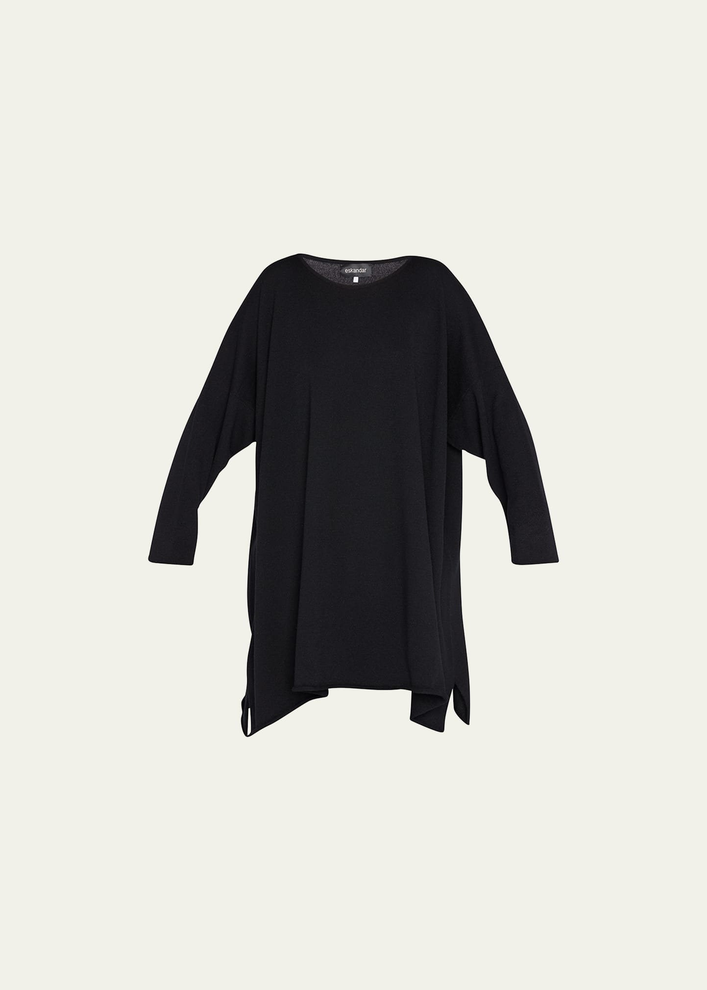 Eskandar knit sweater Bateau neckline Long sleeves; approx. 16.0"L A-line silhouette Long plus Slit handkerchief hem Pullover style Cashmere Unlined Made in United Kingdom
