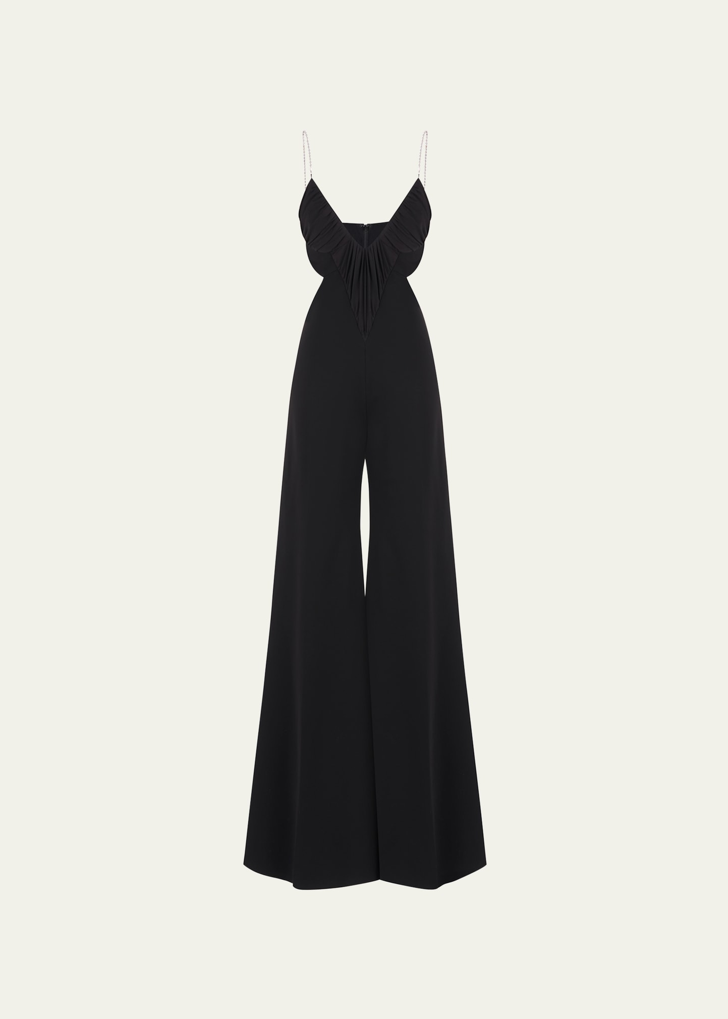 Et Ochs "Adam" ruched-front jumpsuit with side cutout details and rhinestone chain-style straps V-neckline; plunge Sleeveless Concealed back zip Wide legs Full length Viscose/elastane Lining: Polyester/spandex Dry clean Imported