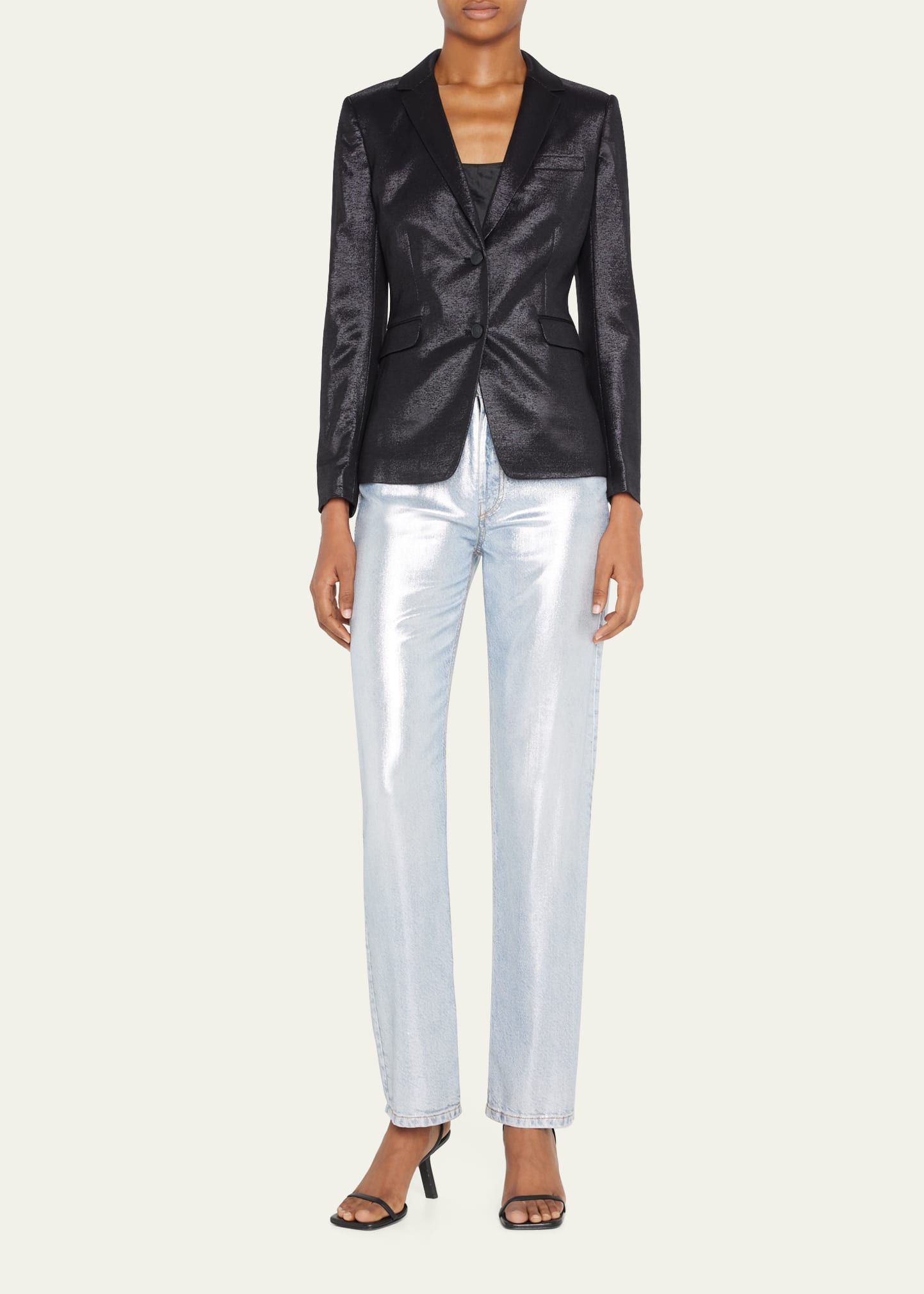 Rag & Bone "Alex" straight-leg jeans in a metallic printed Tencel® lyocell Approx. 32" inseam; 16" leg opening; 12" front rise; 17" back rise (size 29) Four-pocket style High rise Loose, relaxed fit Full length Button/zip fly; belt loops Tencel® lyocell Machine wash cold Imported