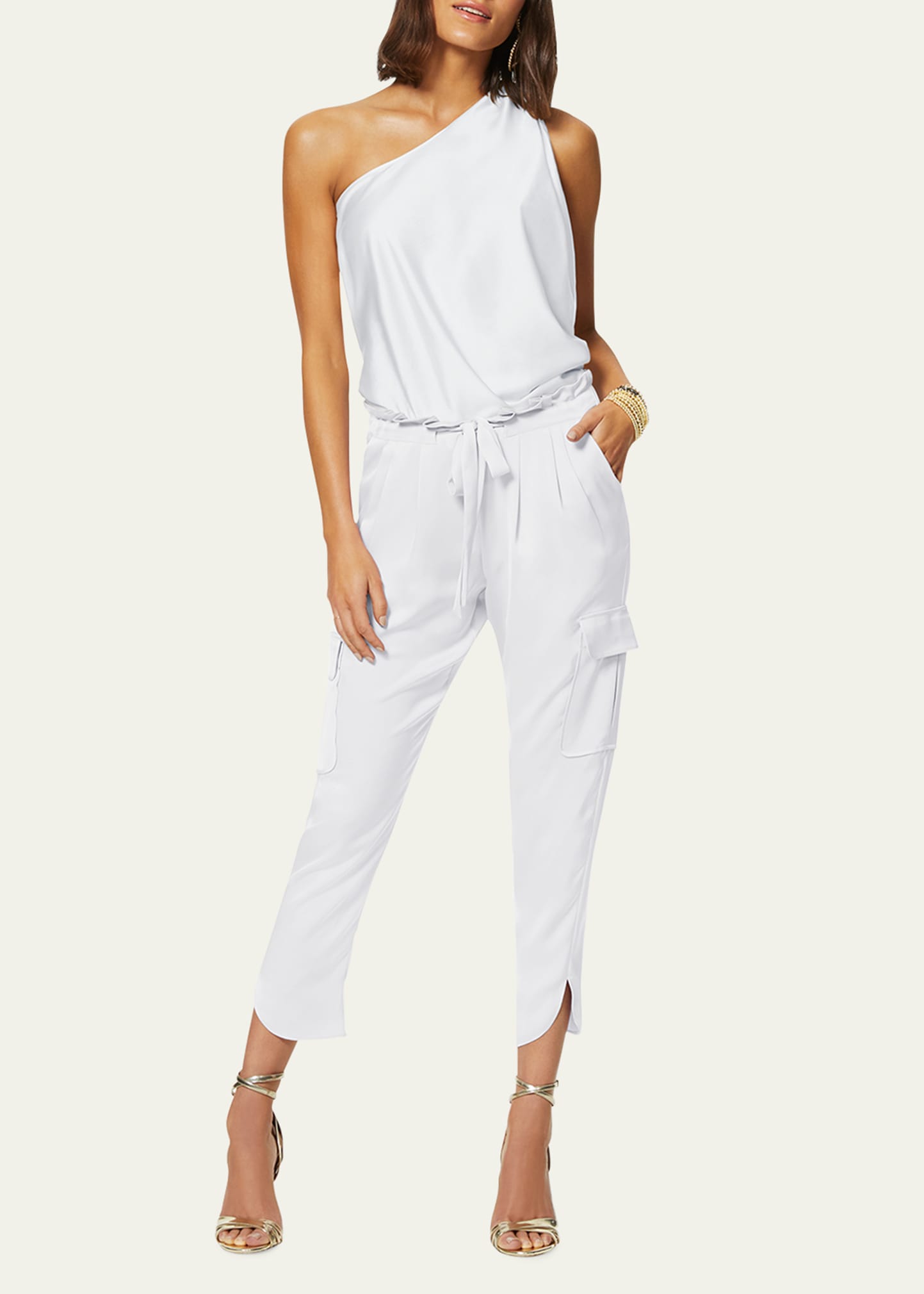 Ramy Brook "Allyn" satin pants. Mid rise; self-tie belt. Pleated front. Side pockets; flap pockets. Straight legs. Cropped above ankles. Pull-on style. Polyester. Dry clean. Imported.