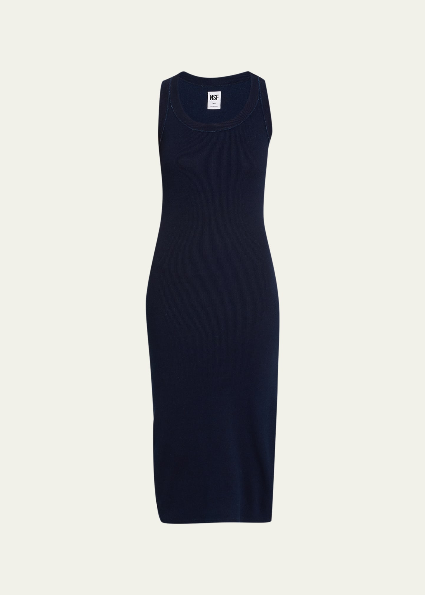 NSF Clothing "Andrea" knit tank dress with frayed trim Scoop neckline Sleeveless Side slit Body-conscious silhouette Midi length Pullover style Cotton/spandex Made in USA