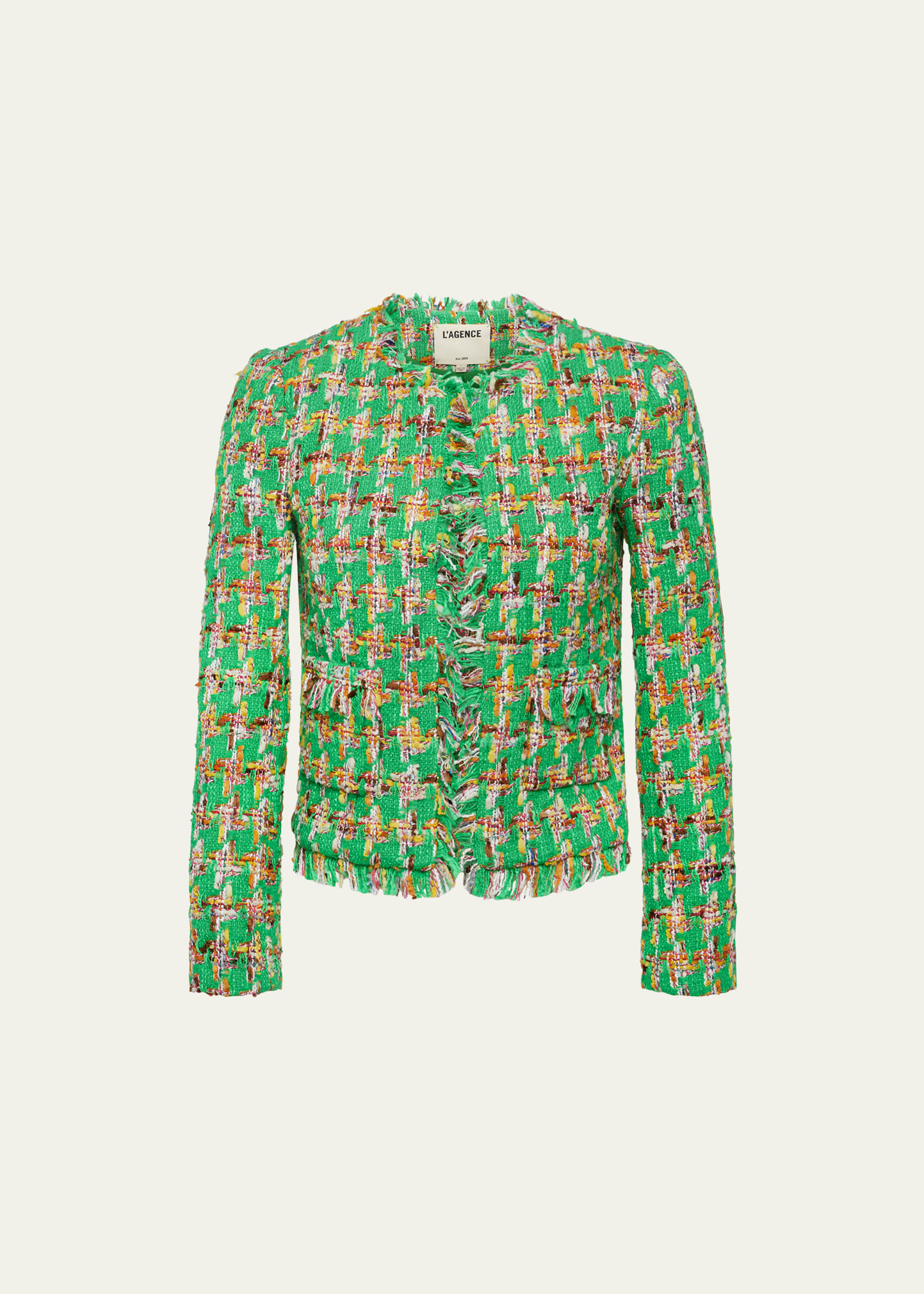 L'Agence "Angelina" tweed blazer finished with fringe trim Approx. 20.8"L from shoulder to hem Crew neckline Open front Long sleeves Button cuffs Front slip pockets Tailored fit Polyester/wool Dry clean Imported