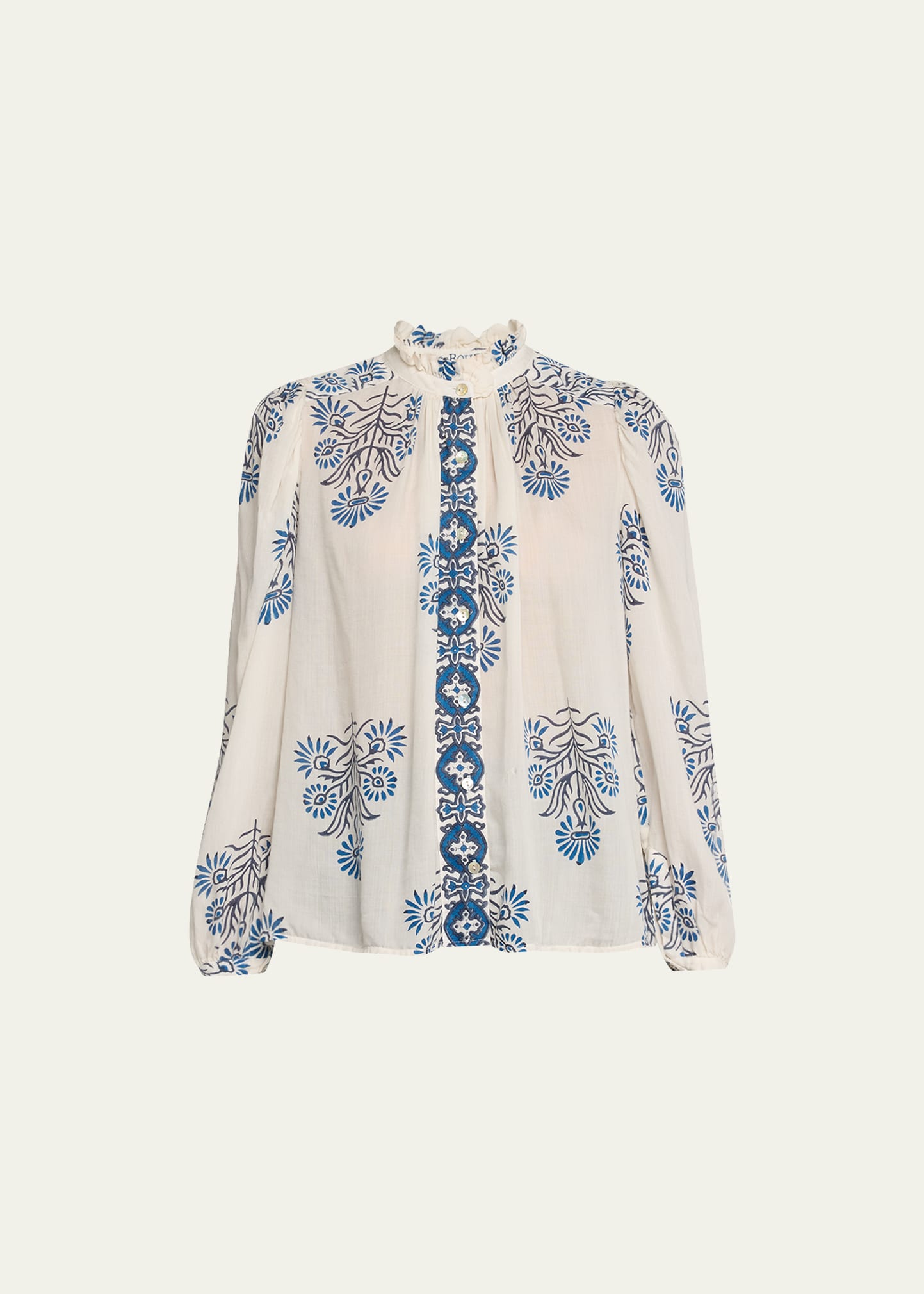 Alix of Bohemia "Annabel" printed button-front shirt featuring a ruffle stand collar Long puff sleeves; button cuffs Loose silhouette Hem falls to the hip Mother-of-pearl buttons Cotton Dry clean Imported