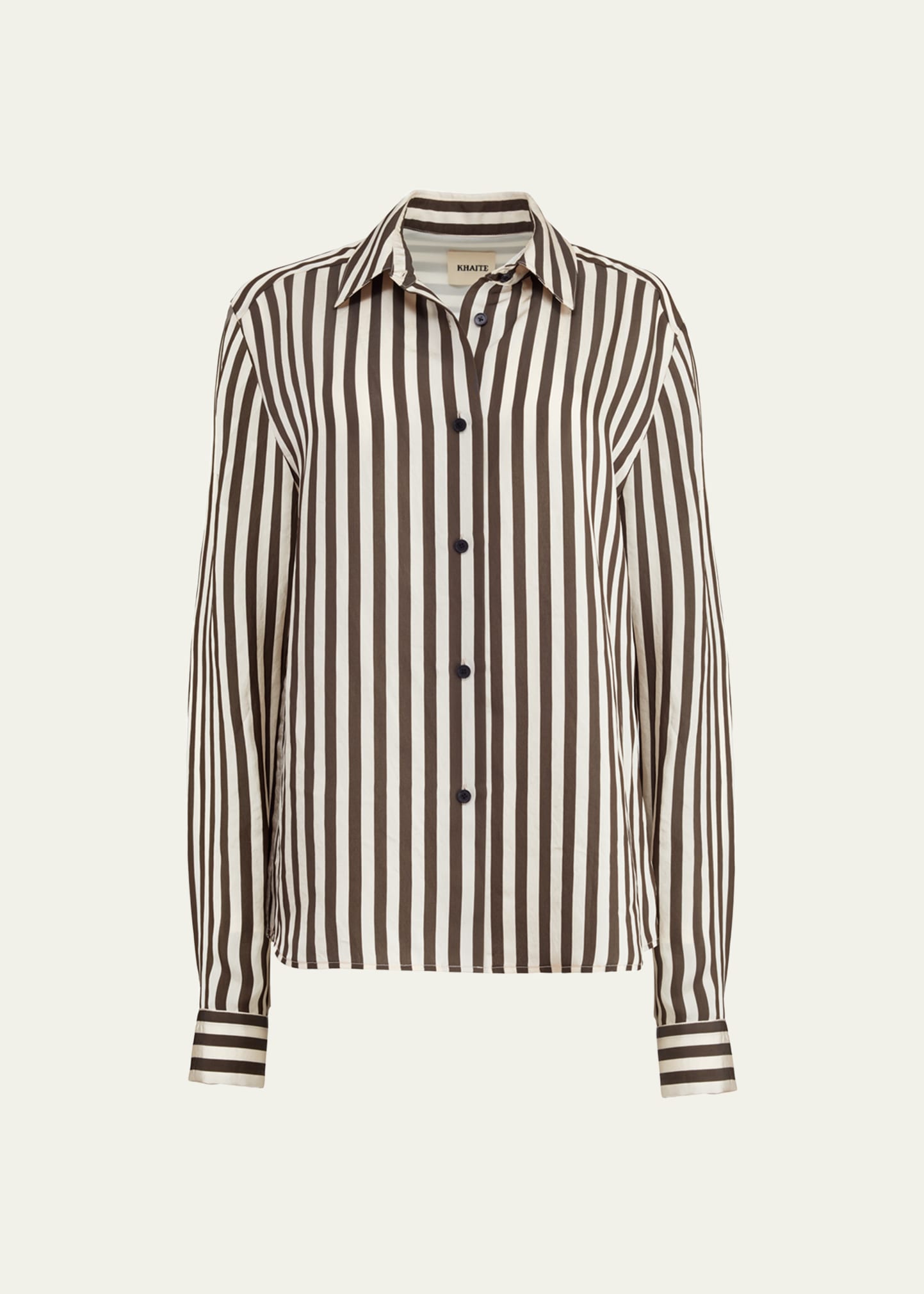 Khaite "Argo" top in stripe motif Spread collar; button front Long sleeves; button cuffs Relaxed fit Back yoke Viscose/silk Imported