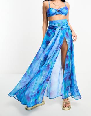 Aria Cove split front tie waist beach skirt in blue marble print - part of a set-Multi