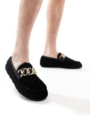 ASOS DESIGN moccasin slippers in black quilted velvet with gold hardware