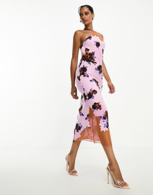 ASOS DESIGN one shoulder strappy midi dress with lace trim in spaced floral-Multi