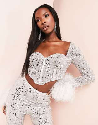 ASOS Luxe sweetheart neck faux feather trim sleeve sequin crop top in silver