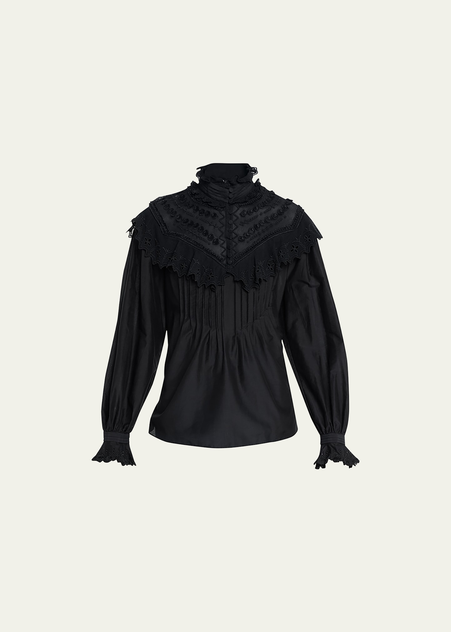 Kobi Halperin "Athena" pintuck blouse with embroidered lace yokes Approx. 26.5"L from shoulders to hem High neckline; button front Long sleeves; button cuffs Relaxed fit Cotton/silk Imported