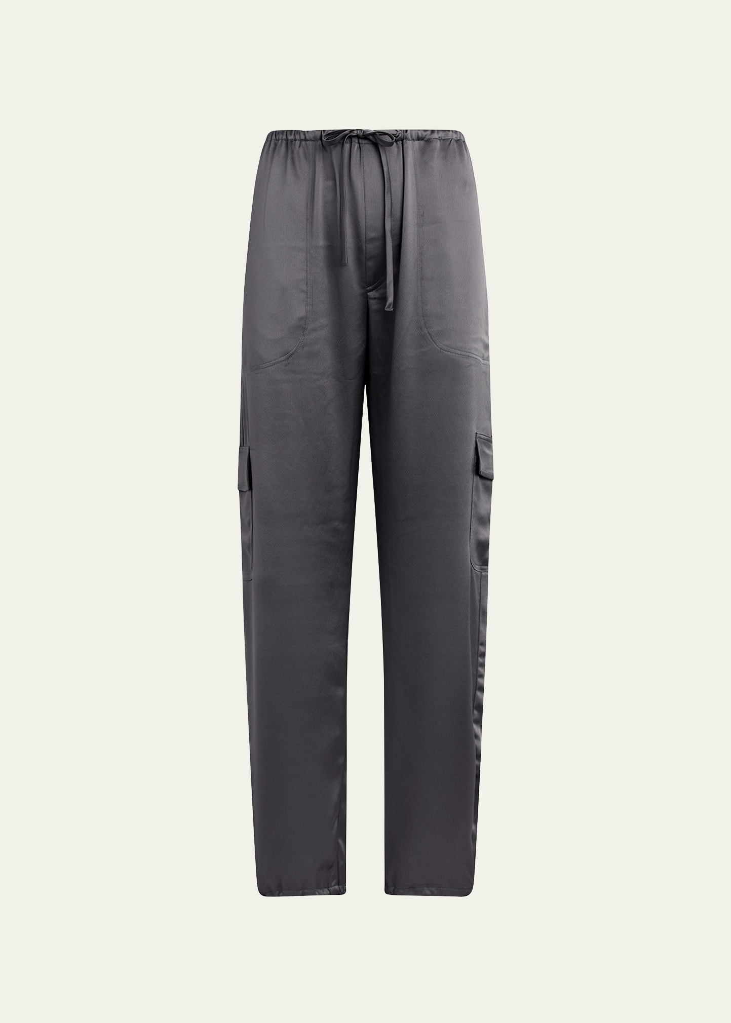 LESET "Barb" satin utilitarian pants with cargo pockets Mid rise; flat front Drawstring waistband Side slash pockets; back patch pockets Relaxed fit; tapered legs Full length Triacetate/polyester Dry clean Made in USA from imported materials