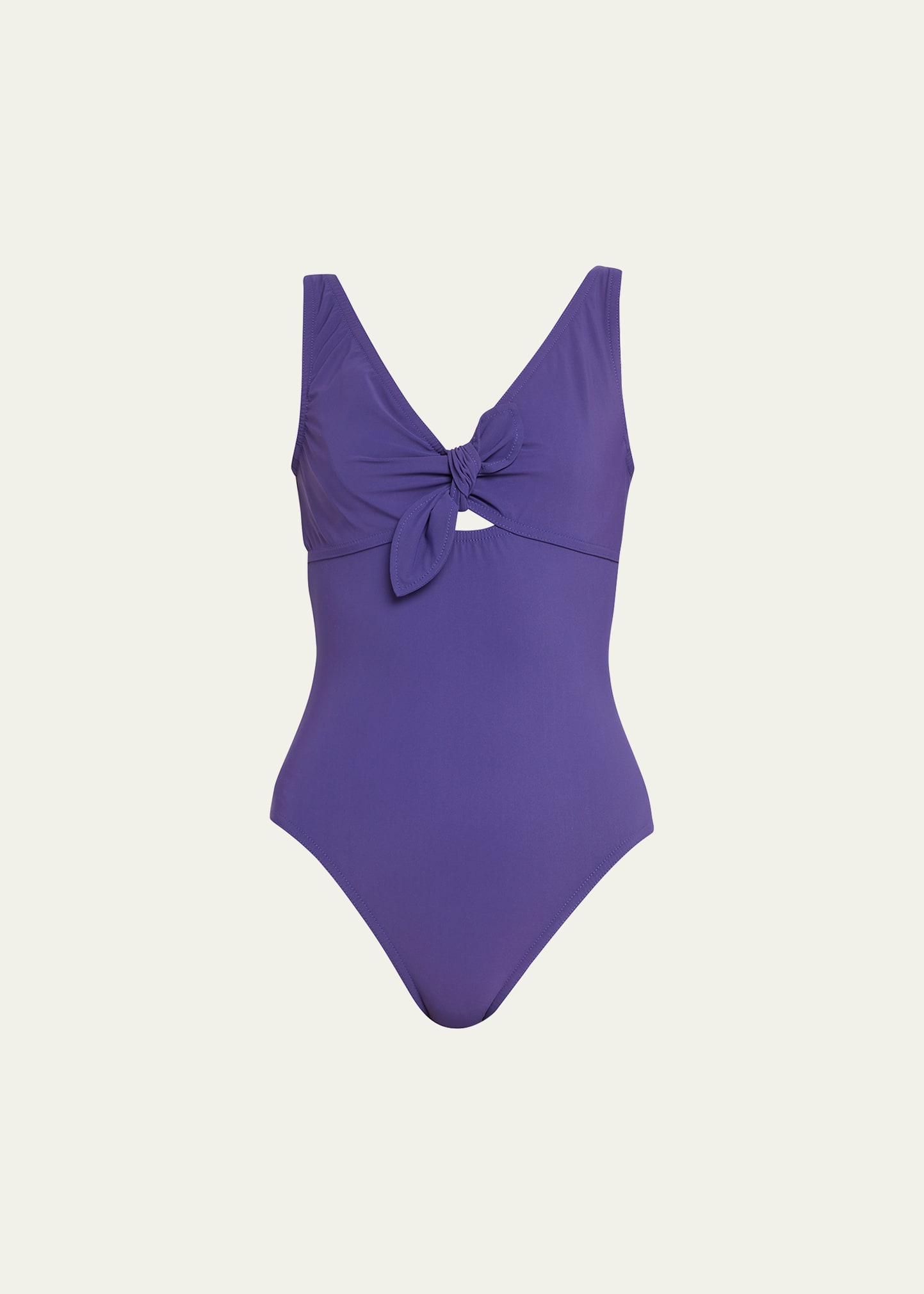 Karla Colletto "Basics" solid one-piece swimsuit accented with a front self-tie knot V neckline Front keyhole cutout Silent underwire Scoop back Full seat coverage Nylon/Lycra® spandex Made in USA