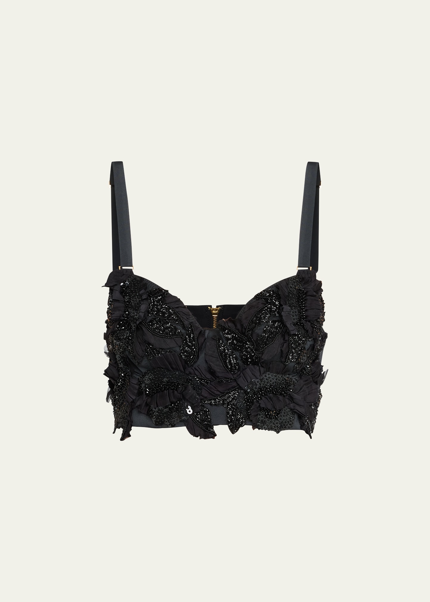 Erdem bra top embellished with allover beading and ruffle detail V neckline Sleeveless; adjustable straps Fitted Cropped length Back zip Polyethylene Acetate/silk, lining Made in United Kingdom