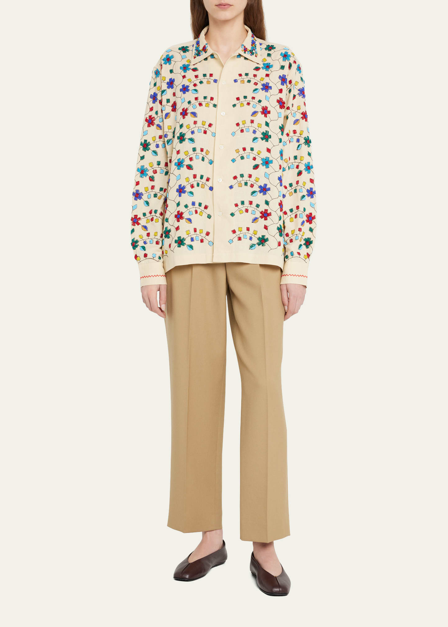 Bode "Beaded Trailing Blossom" contrast stitched shirt with multicolor bead embellishment Point collar; button front Long sleeves; button cuffs Boxy fit Linen/cotton Imported