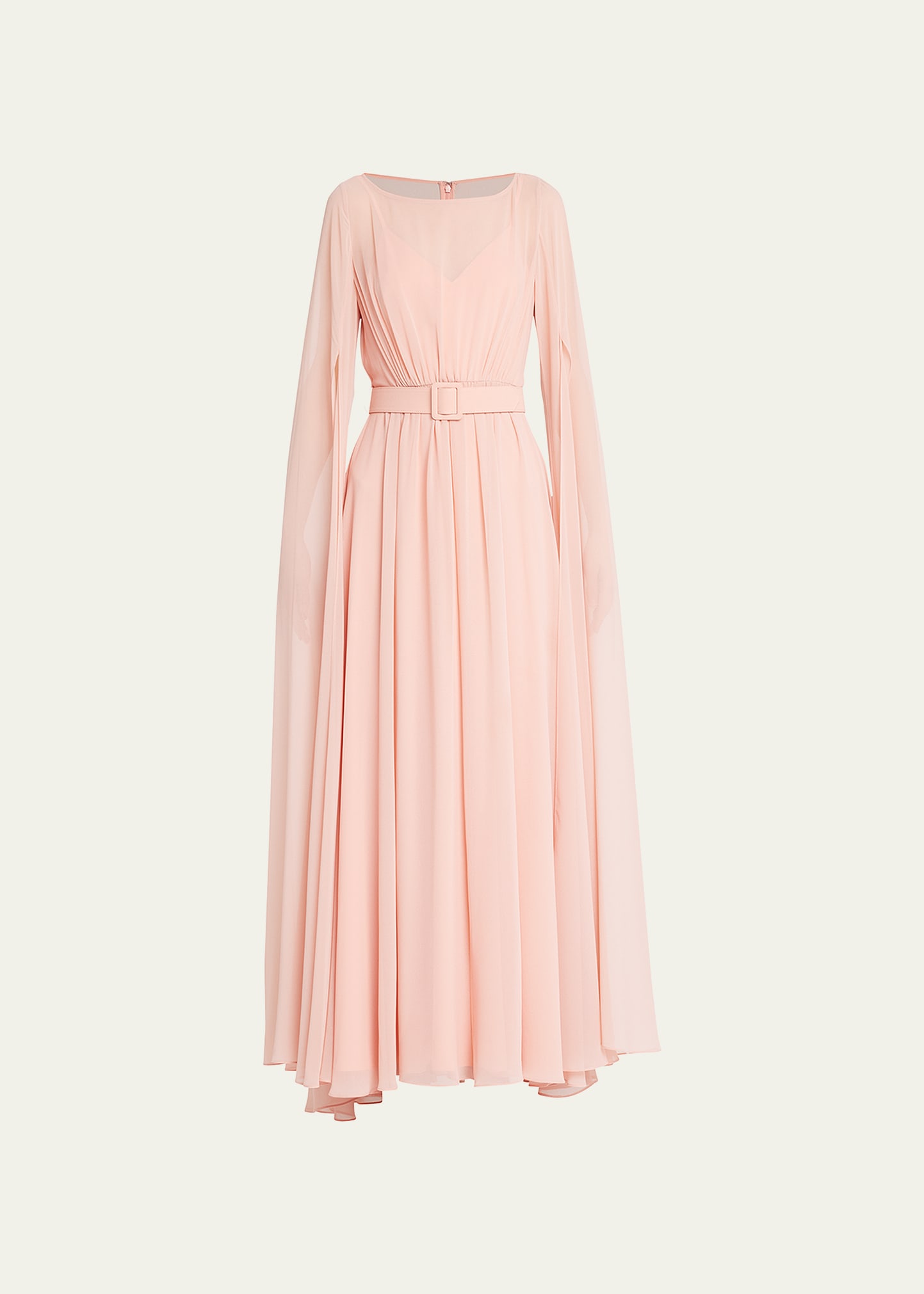 Badgley Mischka Collection gown crafted from georgette High neckline Long cape sleeves Belted waist Floor-sweeping hem A-line silhouette Invisible back zipper Polyester Lining: Polyester Dry clean Imported