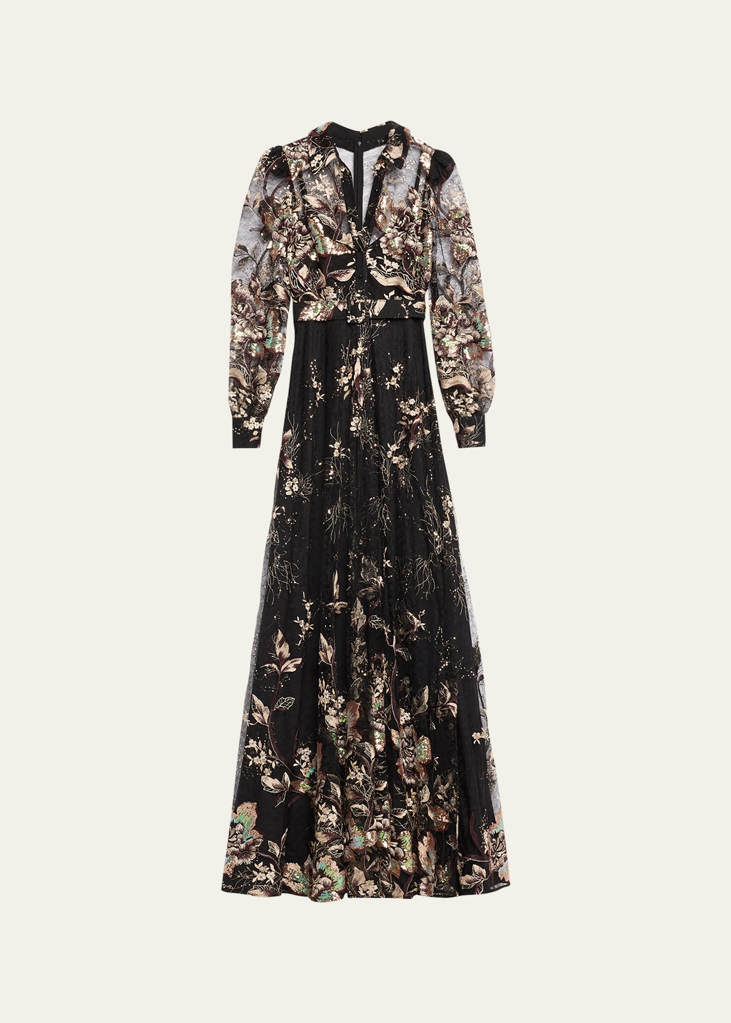 Badgley Mischka Collection lace shirt gown with metallic floral embroidery and sequin embellishments Spread collar; button front Long blouson sleeves; approx. 25.5"L Button cuffs Belted waist Full length A-line silhouette Back zipper Polyester Lining: Polyester Spot clean Imported