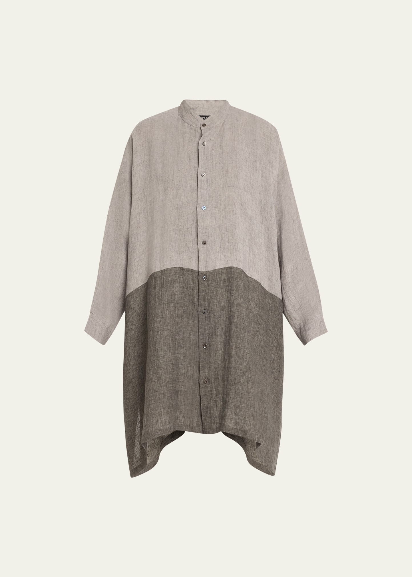Eskandar bicolor shirt with side slit Stand collar; button sewn Long sleeves; button cuffs Wide a-line silhouette Very long length Linen Made in Poland