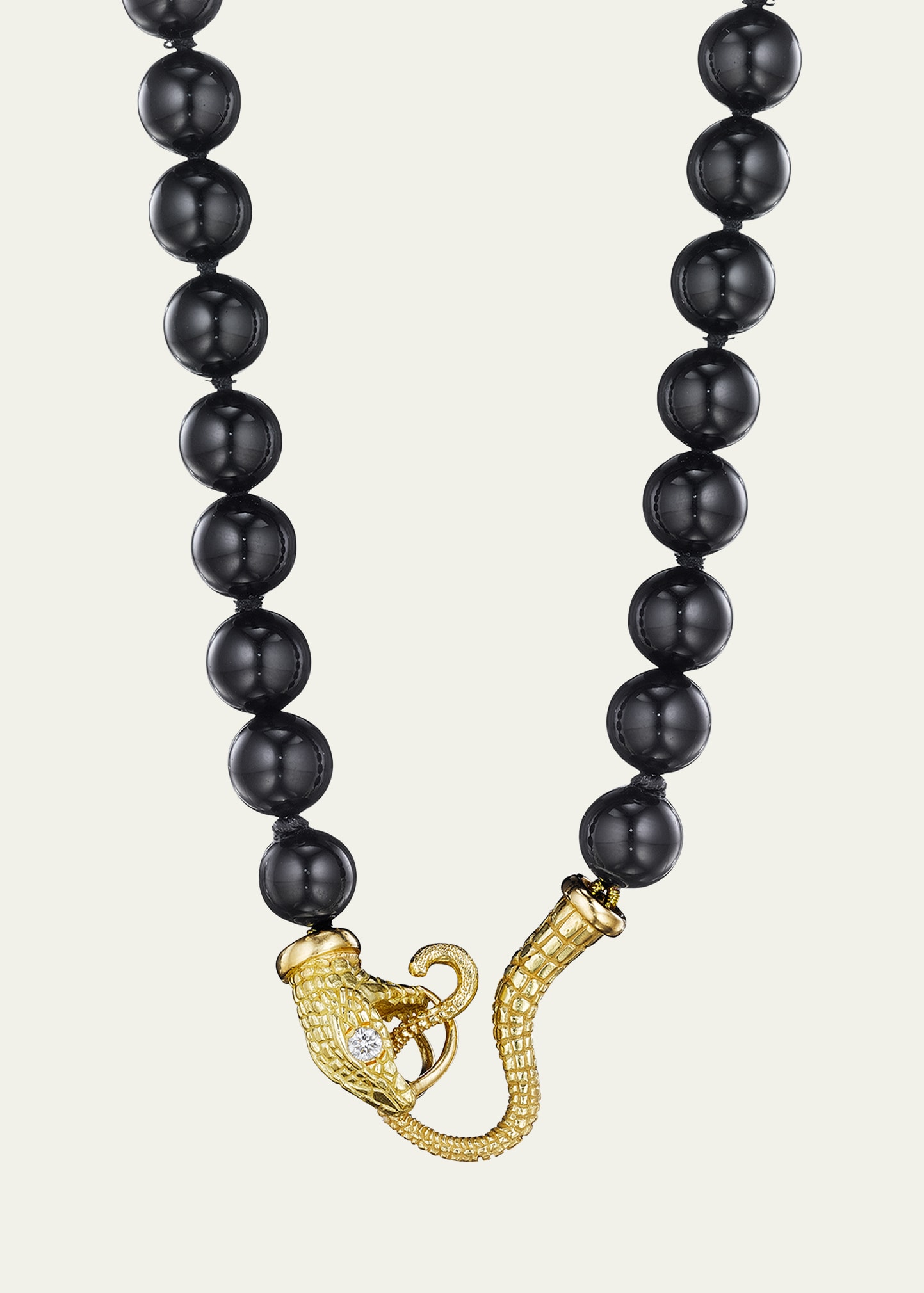 Anthony Lent necklace Approx. 18 inches 18-karat yellow gold Round black onyx beads Serpent clasp with diamonds Diamond total carat weight: 0.14 Adjustable length Made in USA