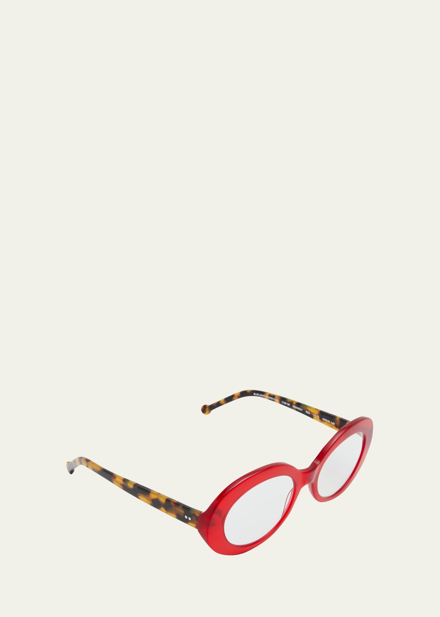 Colors In Optics blue blocking oval sunglasses in acetate Reader's strength: +2.75 Lens/bridge/temple (in mm): 53-20-140 Saddle nose bridge Two dot accents on temples Thin, tapered arms Ready-to-wear clear lenses enhanced by a blue coating able to reduce the risks related to blue light exposure from LED screens Imported
