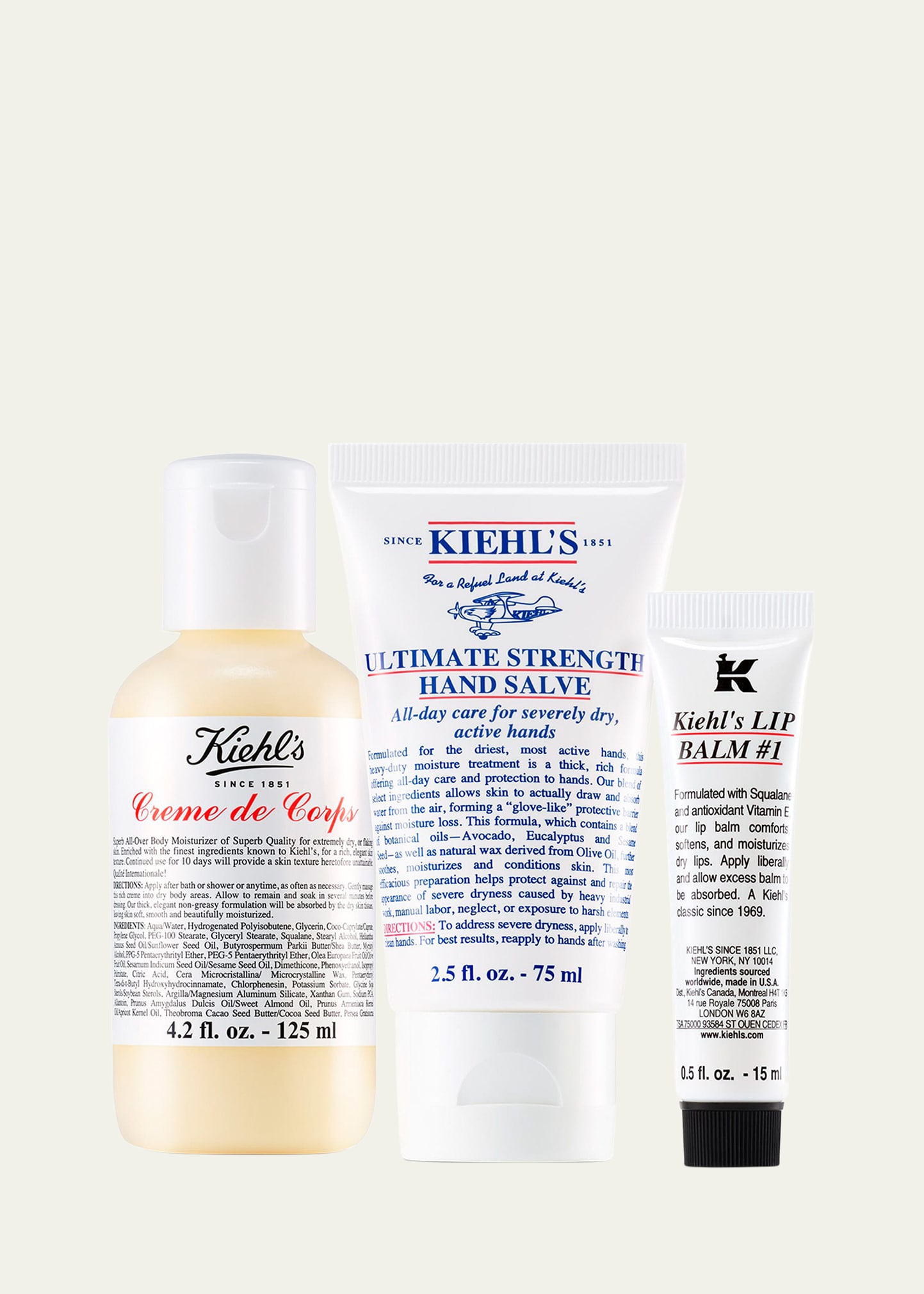 Crème De Corps, 4.2 oz./ 125 m L Ultimate Strength Hand Salve, 2.5 oz./ 75 m L Lip Balm #1, 0.5 oz./ 15 m L Key Ingredients: Squalene: Helps strengthen and restore skin's moisture barrier Shea Butter: Helps defend dehydration, restore suppleness and improve the appearance of dry skin Avocado Seed Oil: Known to moisturize, nourish and soften skin How to Use: Creme de Corps: Apply after bath or shower or anytime, as often as necessary. Gently massage this rich creme into.