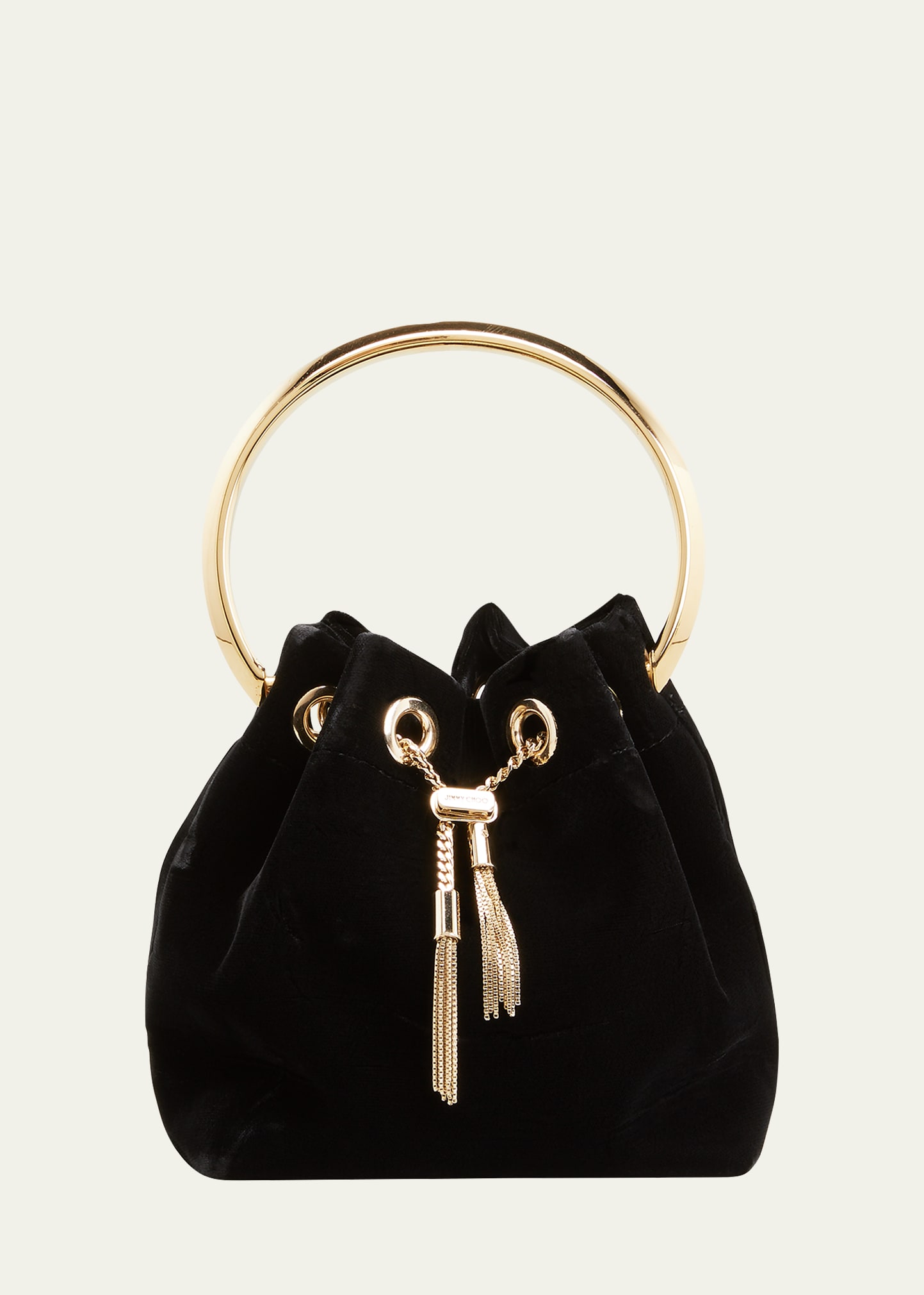 Jimmy Choo "Bon Bon" top-handle bag in velvet. Round metal top handle; box-chain crossbody strap. Metal chain drawstring closure. Textile lining. 5.9"H x 5.5"W x 3.7"D. Made in Italy.