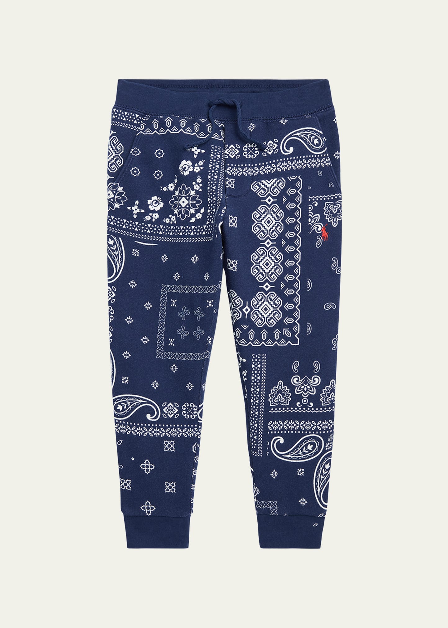 Ralph Lauren Childrenswear bandana-print fleece jogger pants with signature contrast embroidered pony at front Elasticized drawstring waistband Side slip pockets Slip pocket at back Cropped at ankles Relaxed fit Machine washable Cotton/polyester Imported