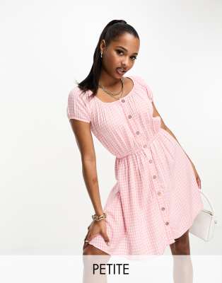 Brave Soul Petite button through mini dress with puff sleeves in pink gingham