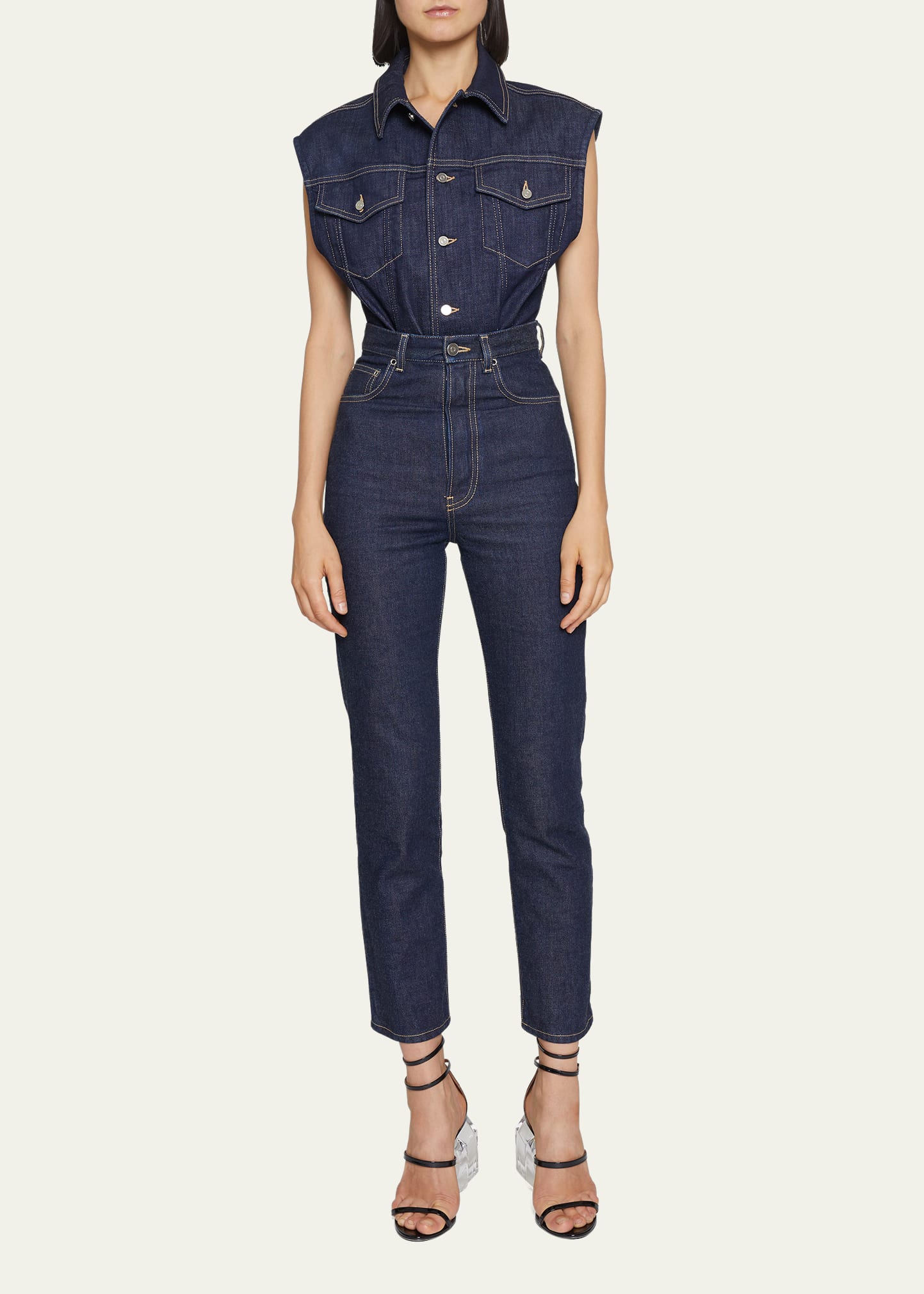 ALAIA denim bodysuit with a button-front vest styling Spread collar Sleeveless Front patch pockets Full seat coverage Relaxed fit Cotton/polyester/viscose Made in Italy