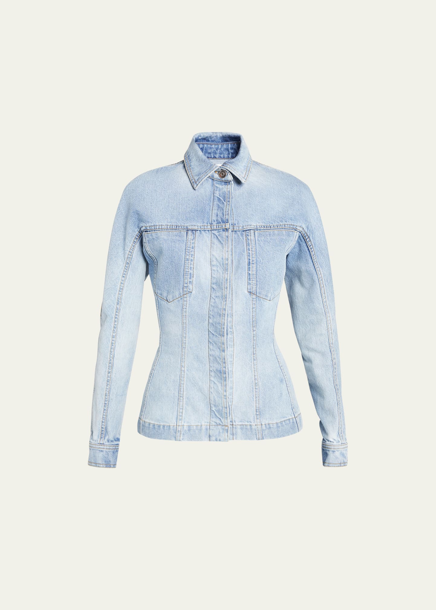 ALAIA fitted denim jacket Spread collar Concealed button-front Long sleeves; button cuffs Front patch pockets Hip length Tailored silhouette Cotton/polyurethane Made in Italy