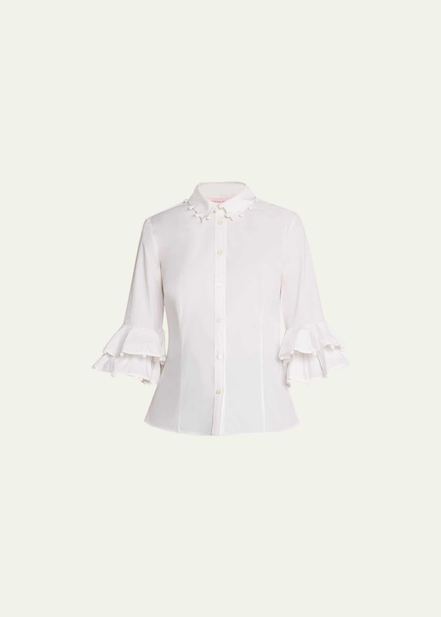 Carolina Herrera button-front shirt features pom details at the collar and ruffle trimming at the sleeves Point collar 3/4 sleeves Hip length Relaxed fit Cotton/polyurethane Dry clean Imported