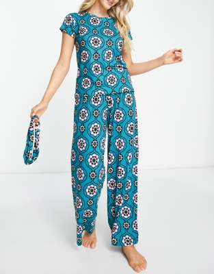 Chelsea Peers 3 piece wide leg pajama and headband set in teal and pink flower mosaic print-Blue