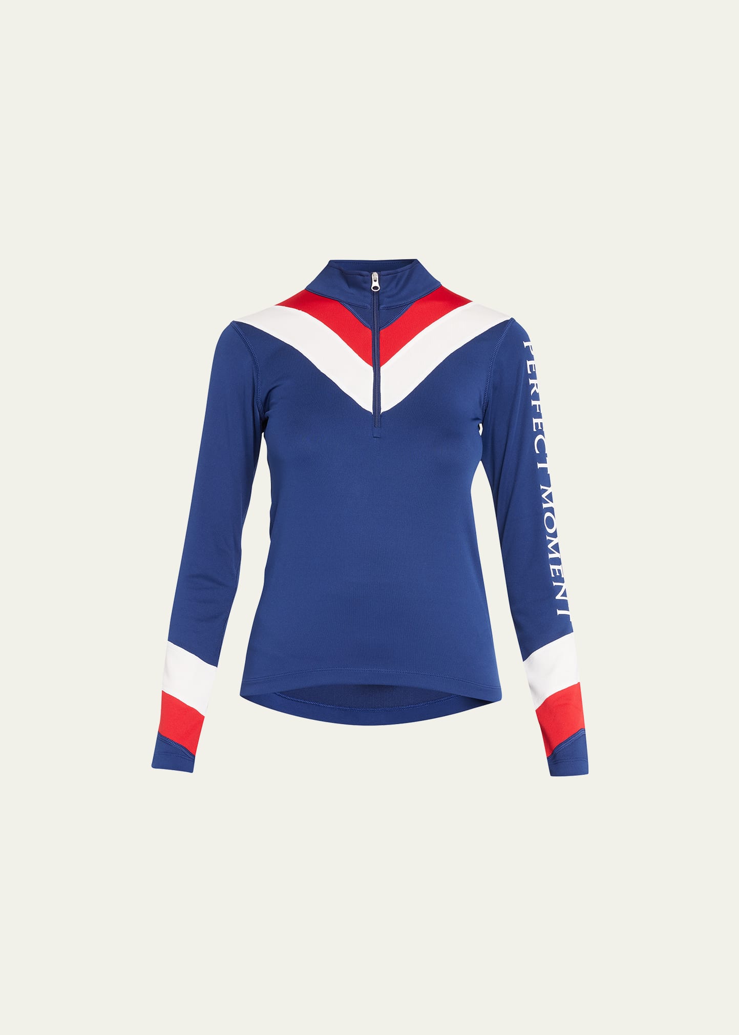 Perfect Moment seamless half-zip thermal in a multicolor chevron styling Mock neckline Long sleeves; logo print at left Hip length Fitted silhouette Pullover style Polyester Imported