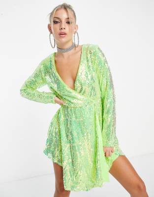 Collective the Label exclusive sequin wrap dress in iridescent lime-Green
