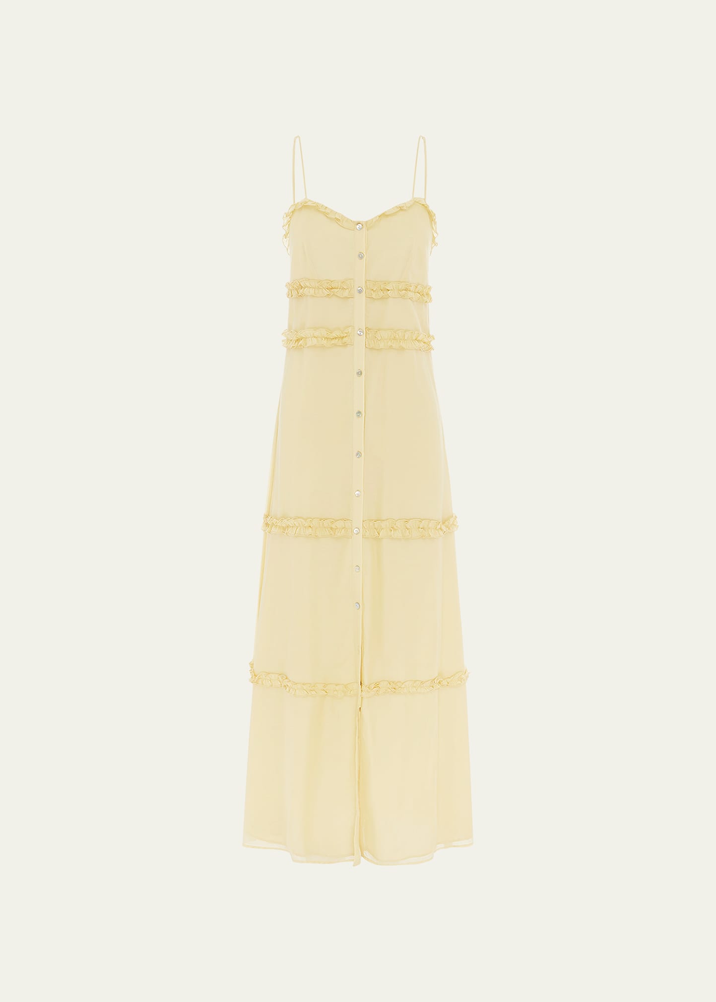 BIRD & KNOLL "Connie" dress accented with ruffle trim details Square neckline; button front Adjustable straps Full length Cotton Machine wash cold Imported