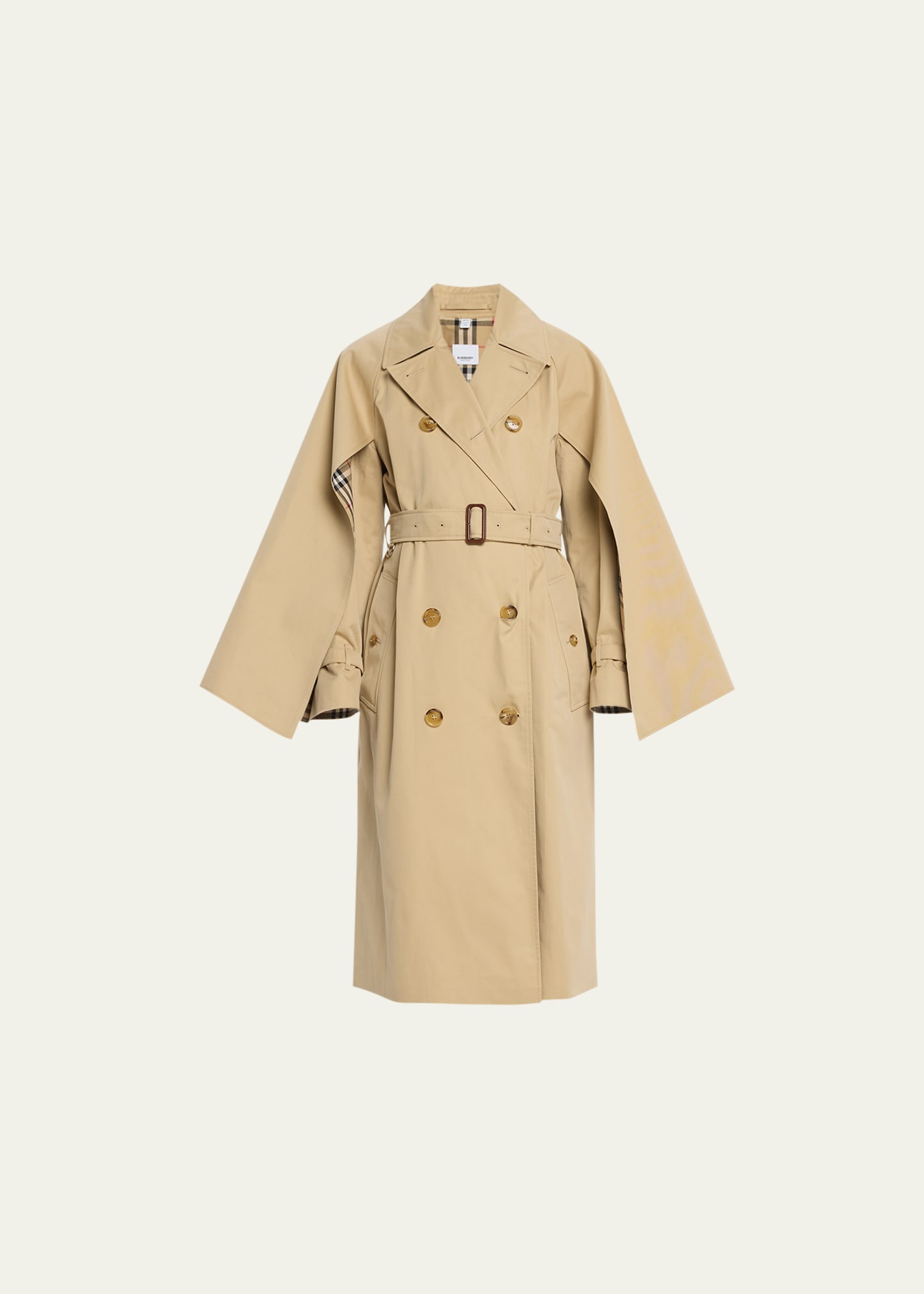 Burberry "Cotness" trench coat in gabardine with check lining Trench collar with check undercollar and throat latch Double-breasted button front Long wide sleeves; belted cuffs Button-through hip pockets D-ring self-belt Slim fit Cotton Professional cleaning recommended Made in Poland