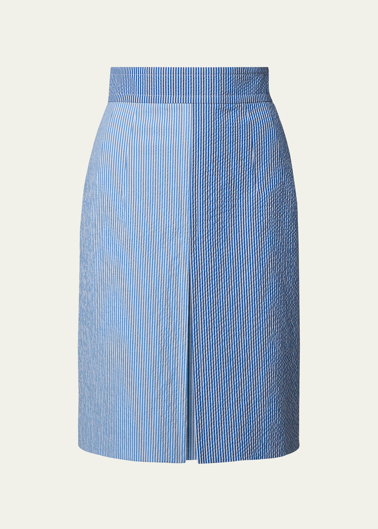 Akris punto cotton seersucker midi skirt in a colorblock styling High rise; banded waist Front pleat Back zip closure Hem hits around the knee A-line silhouette Cotton/spandex Lining: Cupro Made in Romania