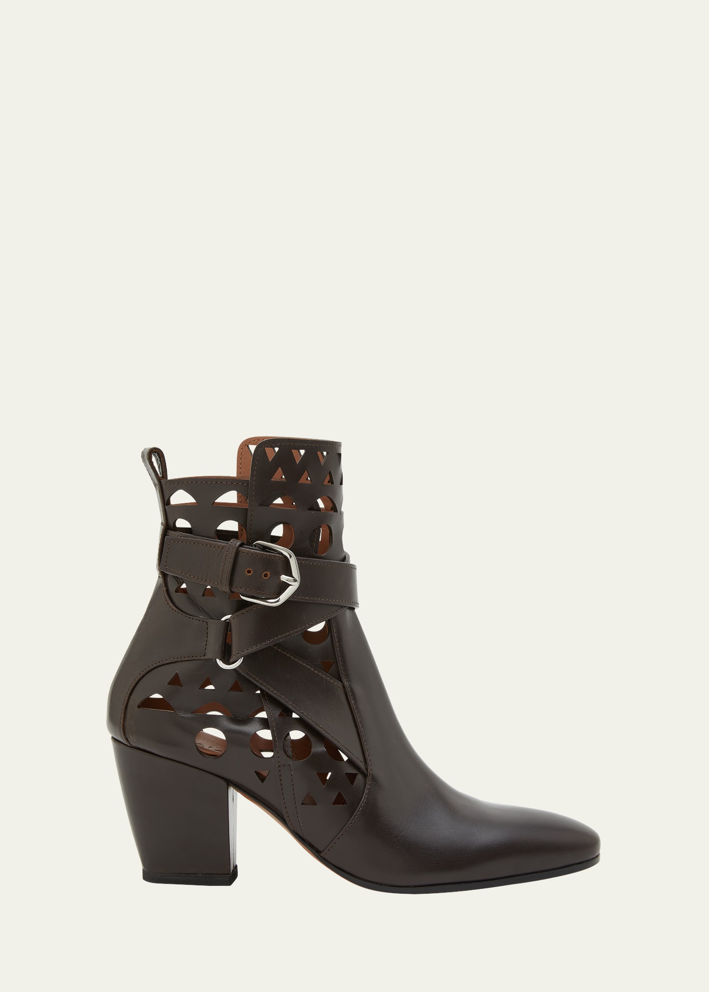 ALAIA laser cut leather ankle boots 2.50 in / 65 mm block heel Round toe Wraparound ankle buckle accent Leather/Rubber outsole Lining: Leather Made in Italy