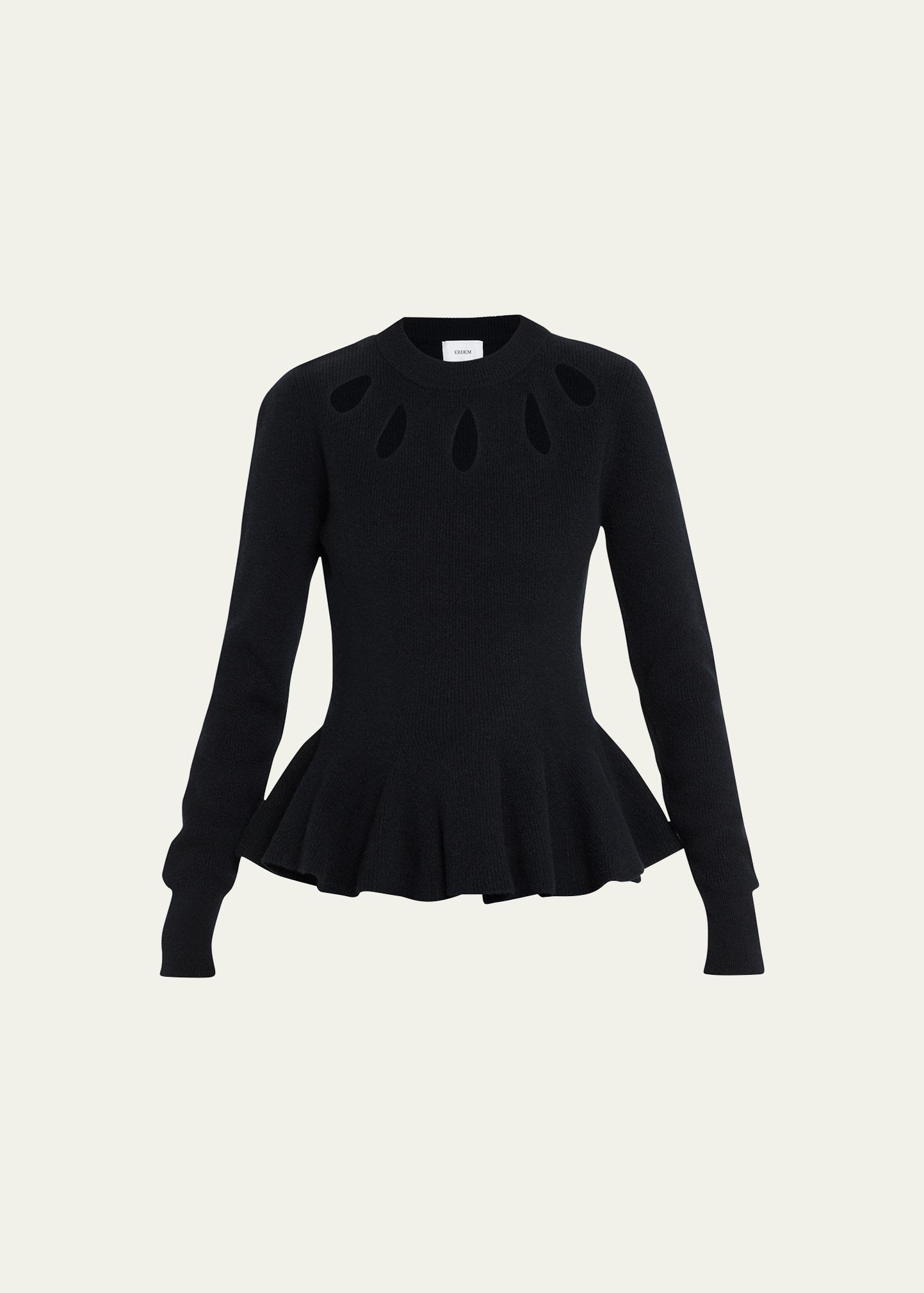Erdem knit sweater with cutout detail around neckline Crew neckline Long sleeves Slim fit Peplum hem Pullover style Wool Made in Romania