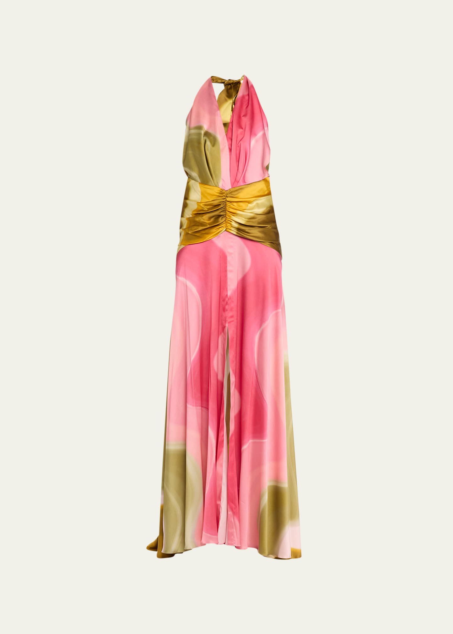 Decorated with abstract waves on luxurious silk, Silvia Tcherassi's fluid Dafne halter gown flaunts a dropped back and ruched waist. Halterneck Sleeveless Nape self-tie 94% silk/6% elastane Dry clean Imported SIZE & FIT Model measurements: 5'10" tall Model is wearing a US size Small