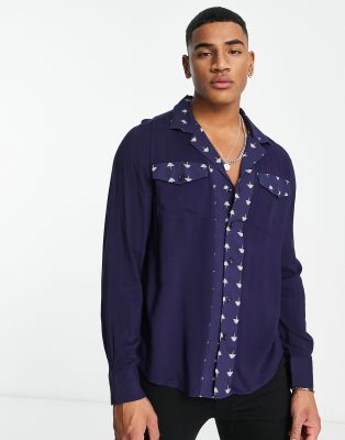 Devils Advocate long sleeve contrast panel and pocket shirt in navy-Neutral