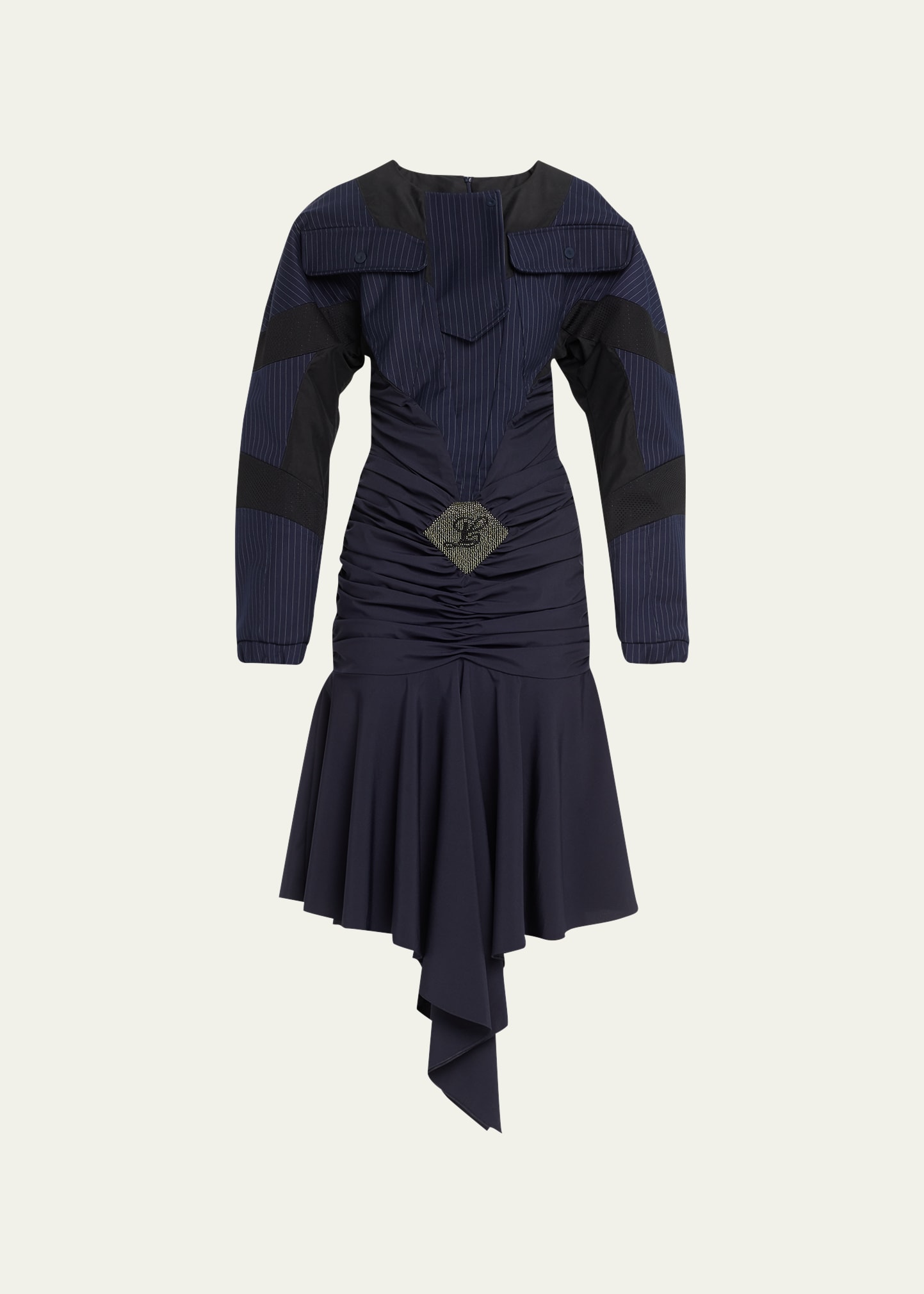 Luar technical gathered dress in pinstripe with diamond monogram detail Jewel neckline; button placket Long sleeves Chest flap-buttoned pockets A-line silhouette Drop waist Knee length Handkerchief hem Back zip Nylon/polyamide Made in Portugal