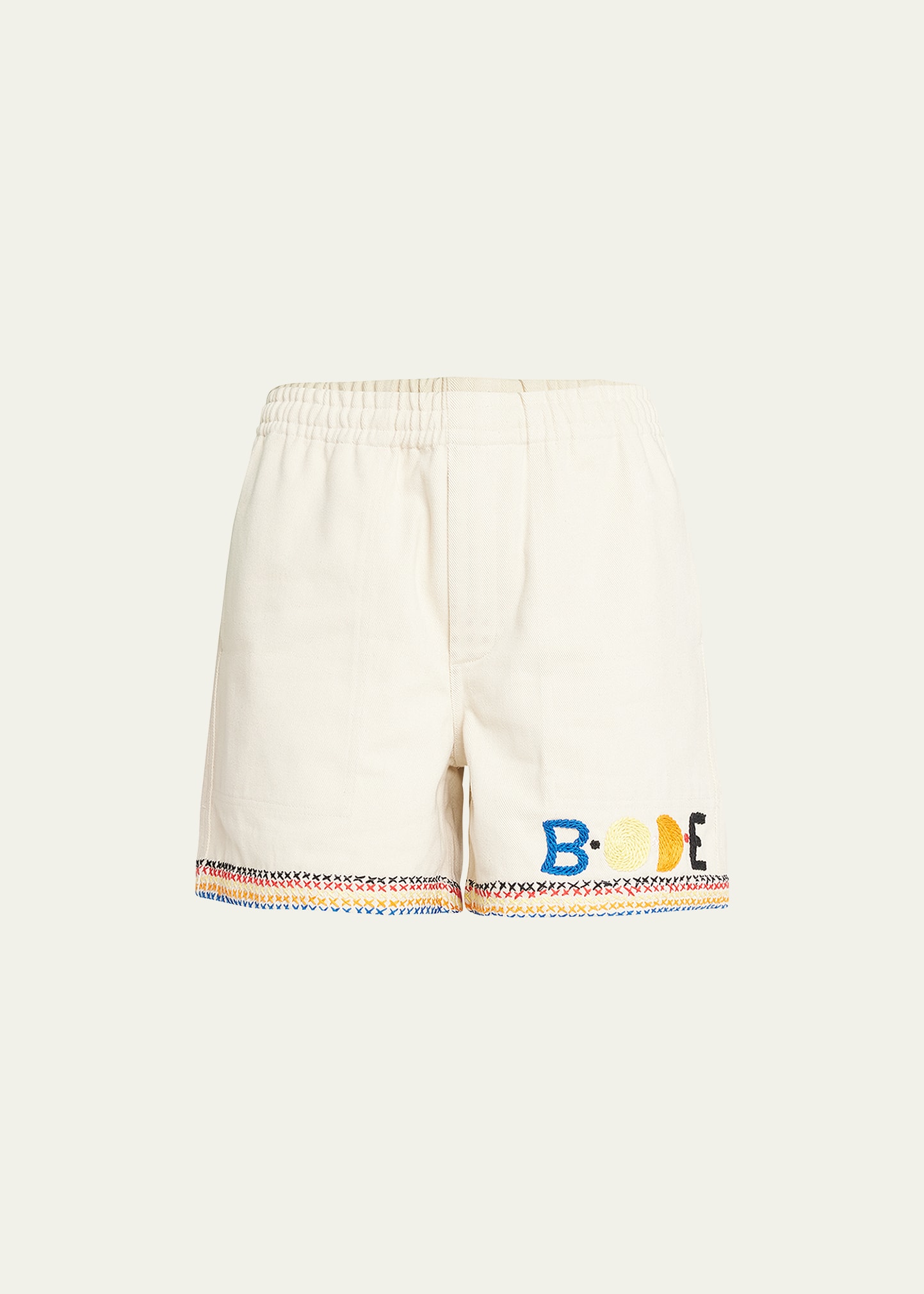 Bode "Donkey Party" rugby shorts with embroidered trim and logo High rise Elastic drawstring waistband Side slip pockets; back patch pocket Relaxed legs Mid-thigh length Step-in style Cotton Imported
