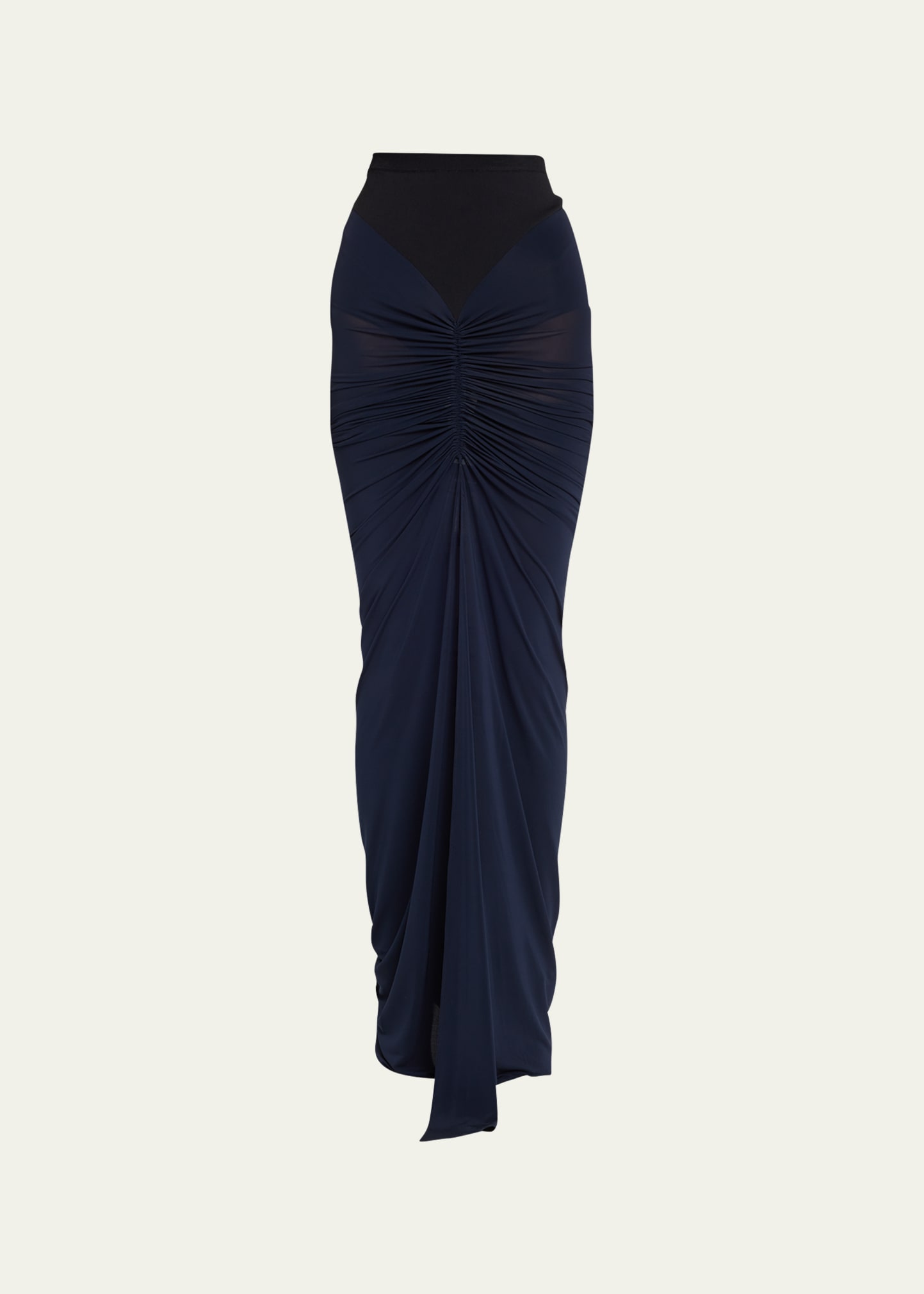 ALAIA draped skit with ruched front High waist Pencil silhouette Full length Pull-on style Viscose/elastane Dry clean Made in Italy