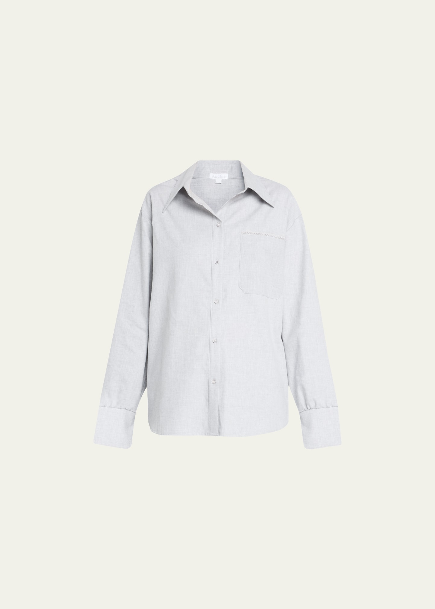 Andine "Essen" shirt features scalloped lace trim at the chest pocket Spread collar; button front Long sleeves; split cuffs Drop shoulders Chest patch pocket Box-pleated back yoke Shirttail hem Oversized fit Polyester/rayon/spandex Made in the USA
